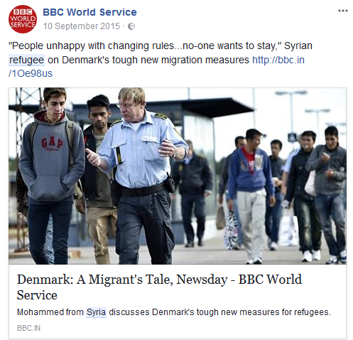 In summary, Al Jazeera employs signs representing the refugee crisis appear to be an ongoing problem in the Middle East, and not simply as one that the West must solve in their own countries. More importantly, it represents the crises as one which seems to be resolved with the focus on integration within host countries. This may be attributed to the perceptions of the majority Western demographics that view the refugee crisis as a European problem to be solved through their migration policy, rather than a humanitarian issue. Moreover, the significance of the Western officer being in the forefront of the image as a police officer, emphasizing their dominant position as a world hegemony that assures that this ‘problem’ of refugees can be controlled. They appear to be more of a collective with BBC due to the innumerable group size, which add to this connotation of fear and dehumanization.